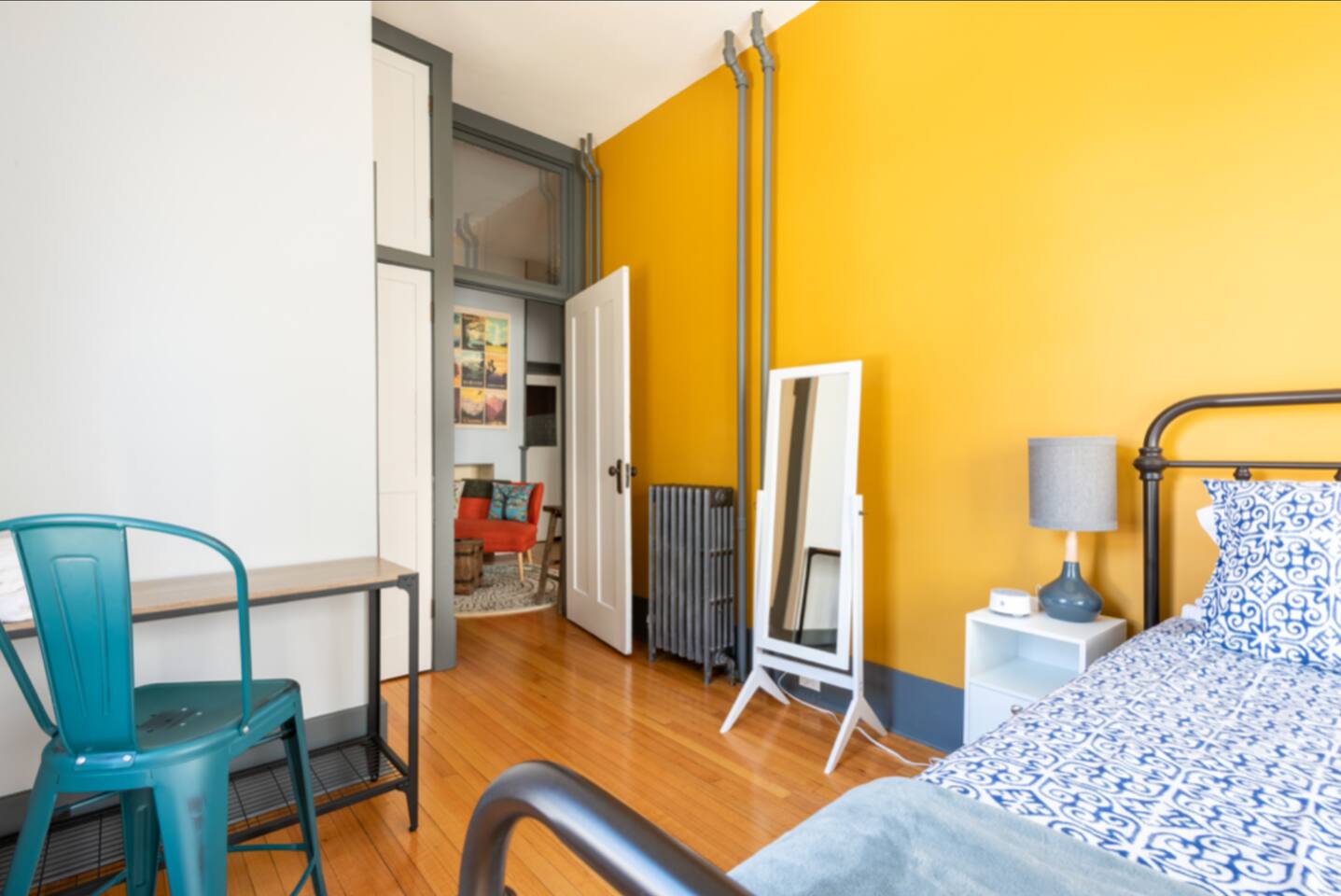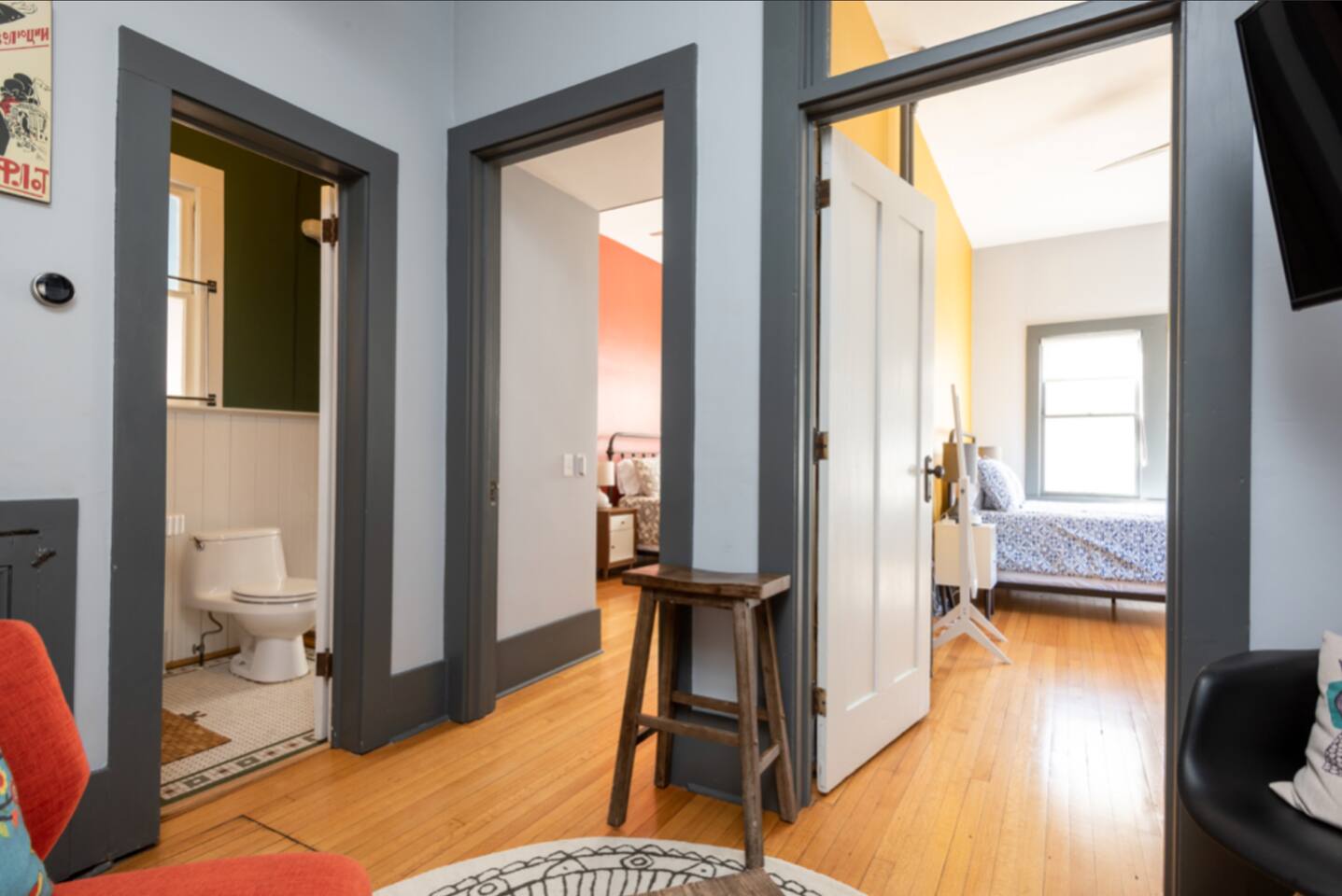 FINE PRINT: This is a very small apartment, with no dining area and just a small sitting room for common space and a galley-style kitchen. It is really intended for guests who will be spending the majority of their time out in the town and not cooking/hanging out indoors. If you are looking for a place with more common/lounging space, we have two other listings in the house (a 2 bedroom and a 3 bedroom) that are much larger with dining rooms and living rooms. Our newly renovated, 2 bedroom apartment has a modern galley kitchen, a small sitting room, a porch, one bathroom, and two nice-sized bedrooms with queen beds. The place is equipped with fast and reliable WiFi, as well as wired internet via ethernet outlets, and a 32" Roku Smart TV with YouTube TV, HBO Max, Hulu, Disney+, AppleTV+, and access to other app-based streaming services (there is no traditional cable/antenna TV service). Heating and cooling is controlled by ductless Mitsubishi AC/heat pump units and bedroom ceiling fans, with backup radiator heat monitored and controlled by a Nest Thermostat. **** Recent Renovations (2023-24): brand new Mitsubishi ductless AC/heat pump units in each bedroom and living area, and new historic-style Pella double-glazed windows throughout the house, helping with temperature control and sound proofing. *** Looking for a 3rd bedroom? This unit can be combined and connected with our "Cozy Guest Suite in Historic Hudson Home" via a lockable pocket door, adding another bedroom and living room with a futon (sleeping between 2-4 more people) and another bathroom. Have a larger group and need more bedrooms? If you think you might need more space or your group could grow, we have 5 more bedrooms located within 2 additional apartments in the same house.