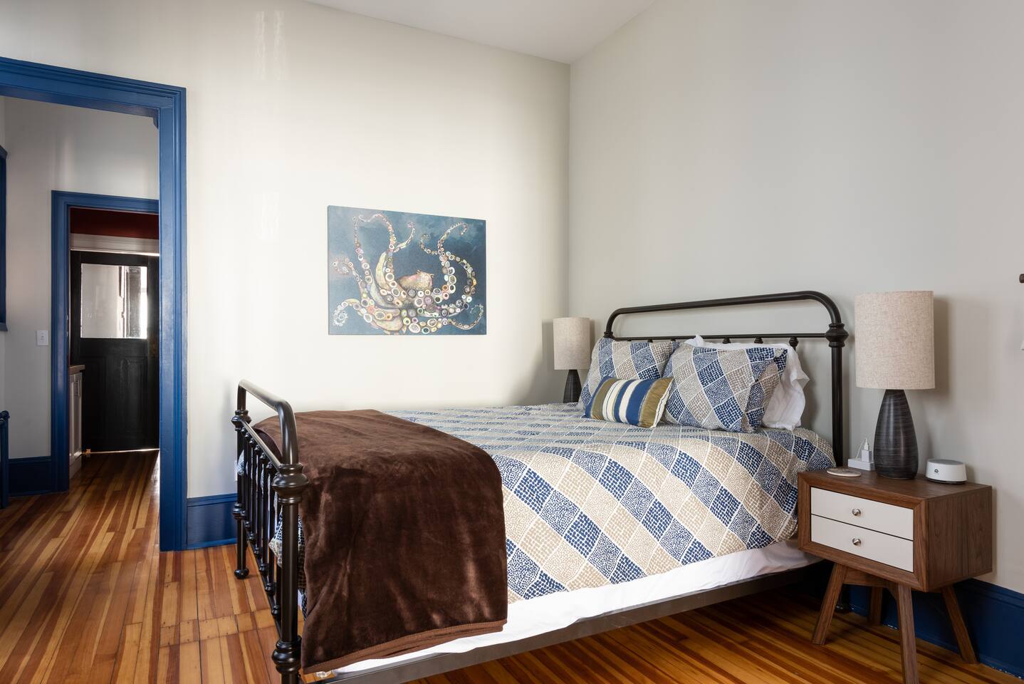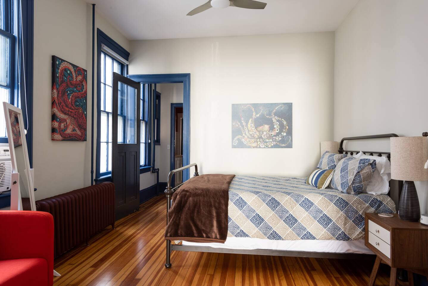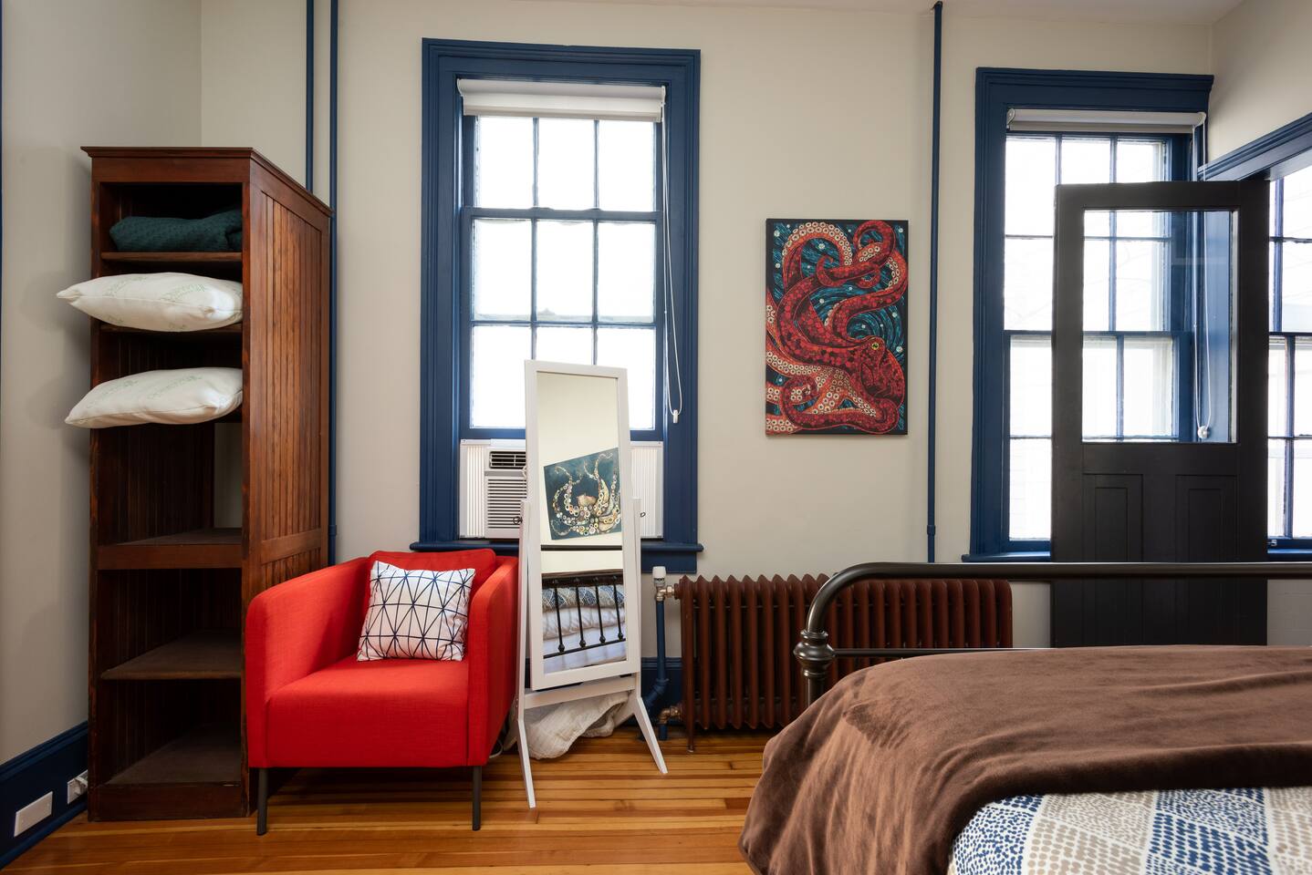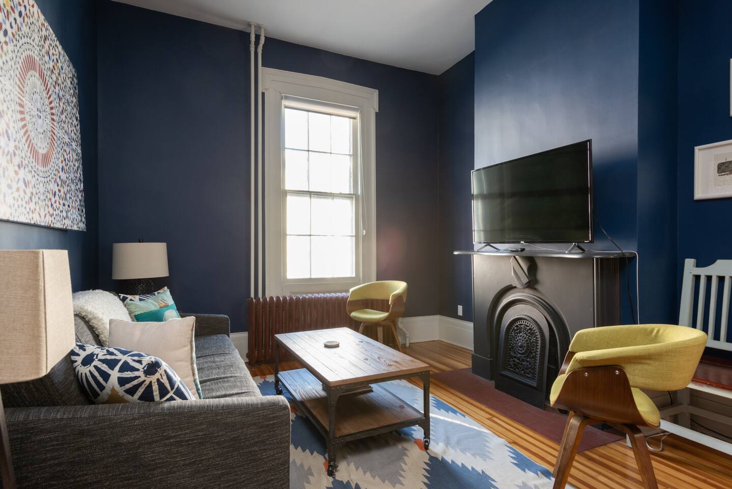 FINE PRINT: This apartment has a relatively small amount of common space for a 3 bedroom, with no dining area, two small living/sitting rooms, and a galley-style kitchen. It is really intended for guests who will be spending the majority of their time out in the town and not cooking/hanging out indoors. If you are looking for a place with more common/lounging space, we have two other listings in the house (a 2 bedroom and a 3 bedroom) that are much larger with dining rooms and living rooms. Our newly renovated, 3 bedroom apartment has a modern galley kitchen, two sitting rooms, a porch, two bathrooms, and three nice-sized bedrooms with queen beds. The place is equipped with fast and reliable WiFi, as well as wired internet via ethernet outlets, and two Roku Smart TVs (one 32" and one 40") with YouTube TV, HBO Max, Hulu, Disney+, AppleTV+, and access to other app-based streaming services (there is no traditional cable/antenna TV service). Heating and cooling is controlled by ductless Mitsubishi AC/heat pump units, bedroom ceiling fans, with backup radiator heat monitored and controlled by a Nest Thermostat. **** Recent Renovations (2023-24): brand new Mitsubishi ductless AC/heat pump units in each bedroom and living area, new historic-style Pella double-glazed windows throughout the house, and blackout shades in all of the bedrooms, helping with temperature control and sound proofing. *** Have a larger group and need more bedrooms? If you think you might need more space or your group could grow, we have 5 more bedrooms located within 2 additional apartments in the same house.