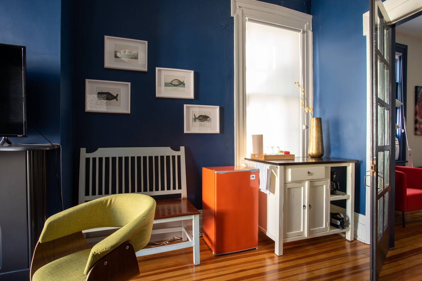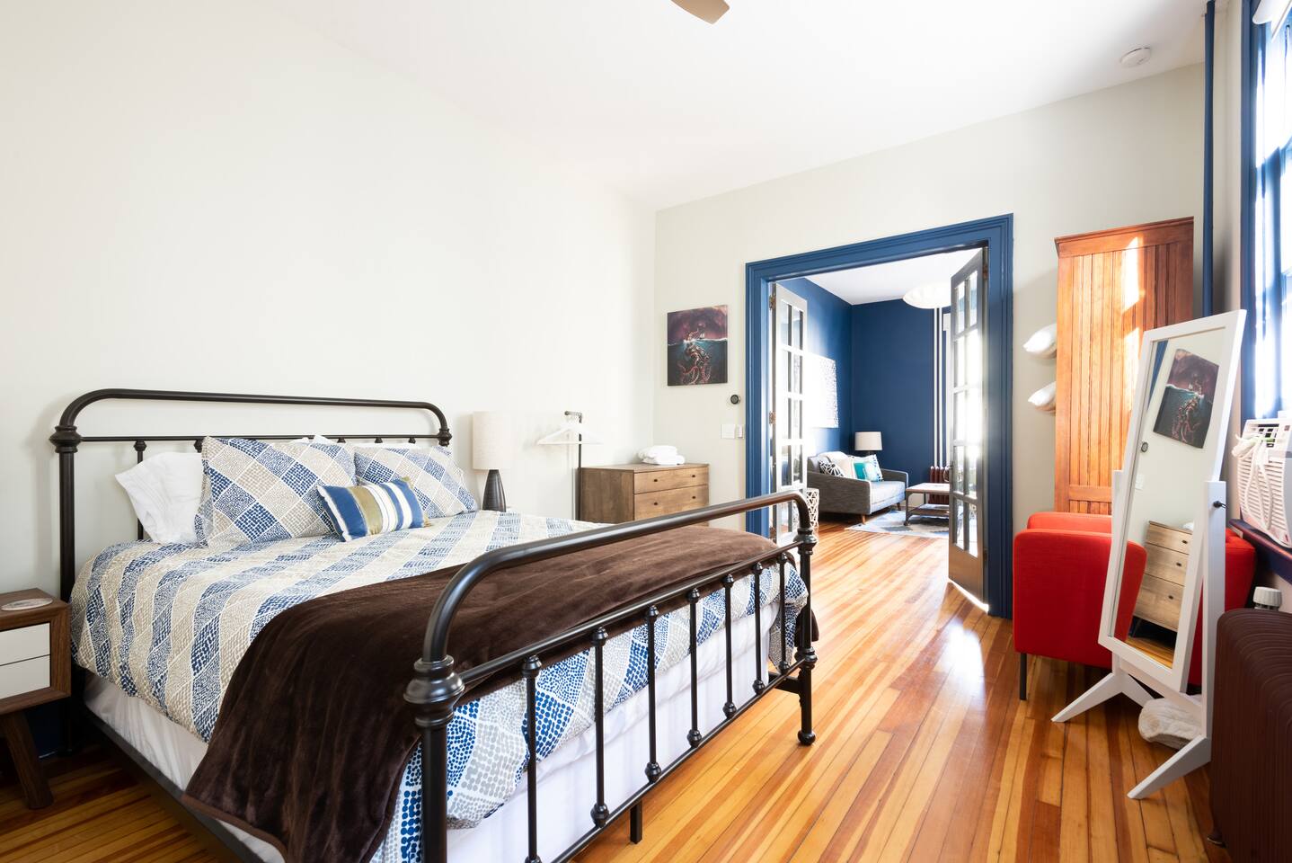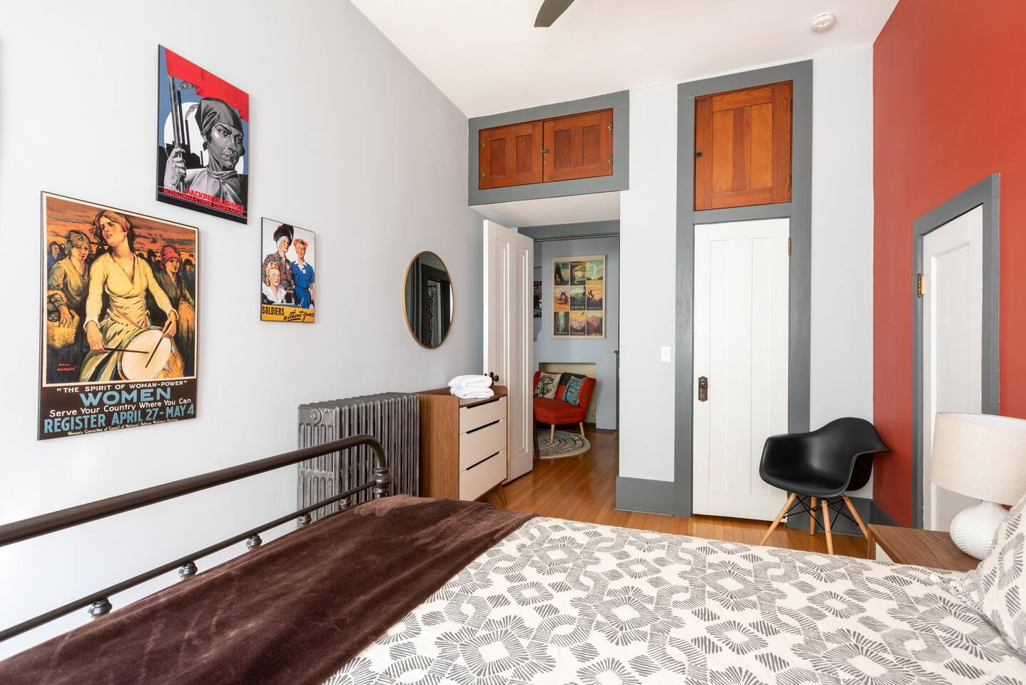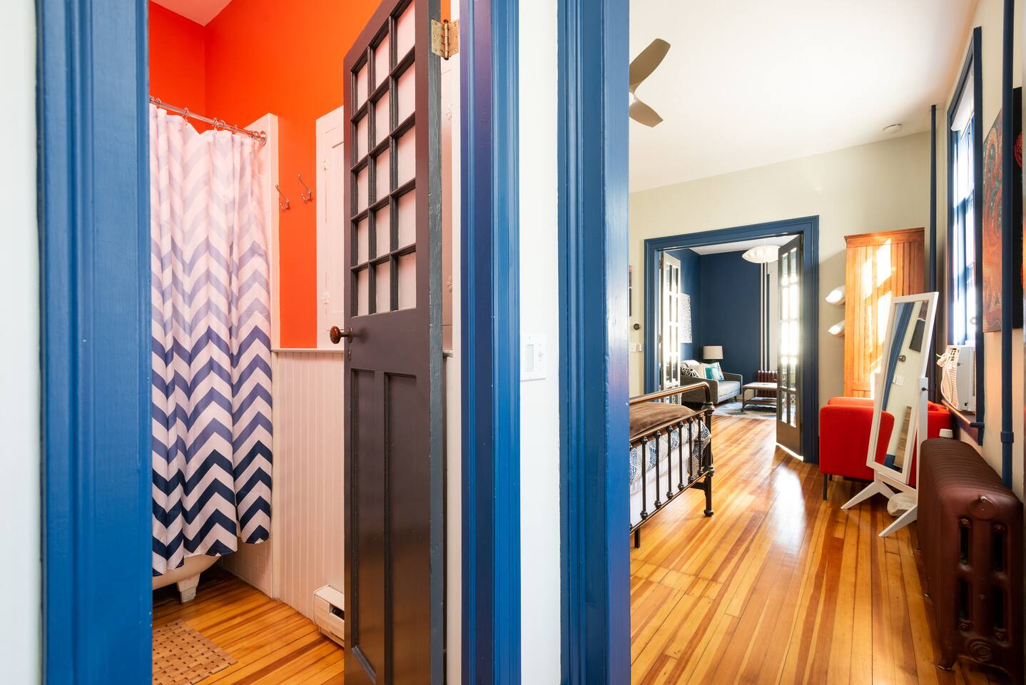 FINE PRINT: This apartment has a relatively small amount of common space for a 3 bedroom, with no dining area, two small living/sitting rooms, and a galley-style kitchen. It is really intended for guests who will be spending the majority of their time out in the town and not cooking/hanging out indoors. If you are looking for a place with more common/lounging space, we have two other listings in the house (a 2 bedroom and a 3 bedroom) that are much larger with dining rooms and living rooms. Our newly renovated, 3 bedroom apartment has a modern galley kitchen, two sitting rooms, a porch, two bathrooms, and three nice-sized bedrooms with queen beds. The place is equipped with fast and reliable WiFi, as well as wired internet via ethernet outlets, and two Roku Smart TVs (one 32" and one 40") with YouTube TV, HBO Max, Hulu, Disney+, AppleTV+, and access to other app-based streaming services (there is no traditional cable/antenna TV service). Heating and cooling is controlled by ductless Mitsubishi AC/heat pump units, bedroom ceiling fans, with backup radiator heat monitored and controlled by a Nest Thermostat. **** Recent Renovations (2023-24): brand new Mitsubishi ductless AC/heat pump units in each bedroom and living area, new historic-style Pella double-glazed windows throughout the house, and blackout shades in all of the bedrooms, helping with temperature control and sound proofing. *** Have a larger group and need more bedrooms? If you think you might need more space or your group could grow, we have 5 more bedrooms located within 2 additional apartments in the same house.
